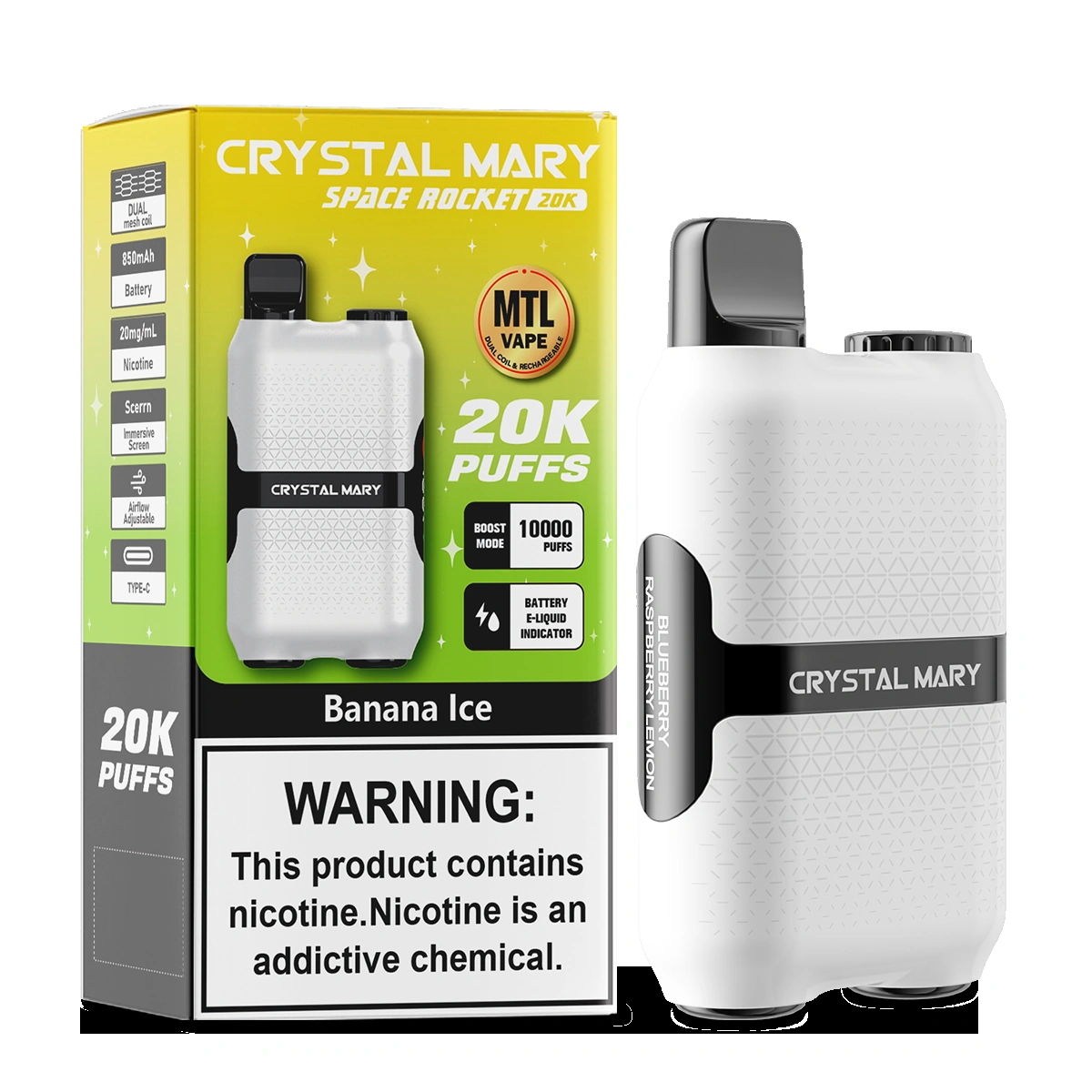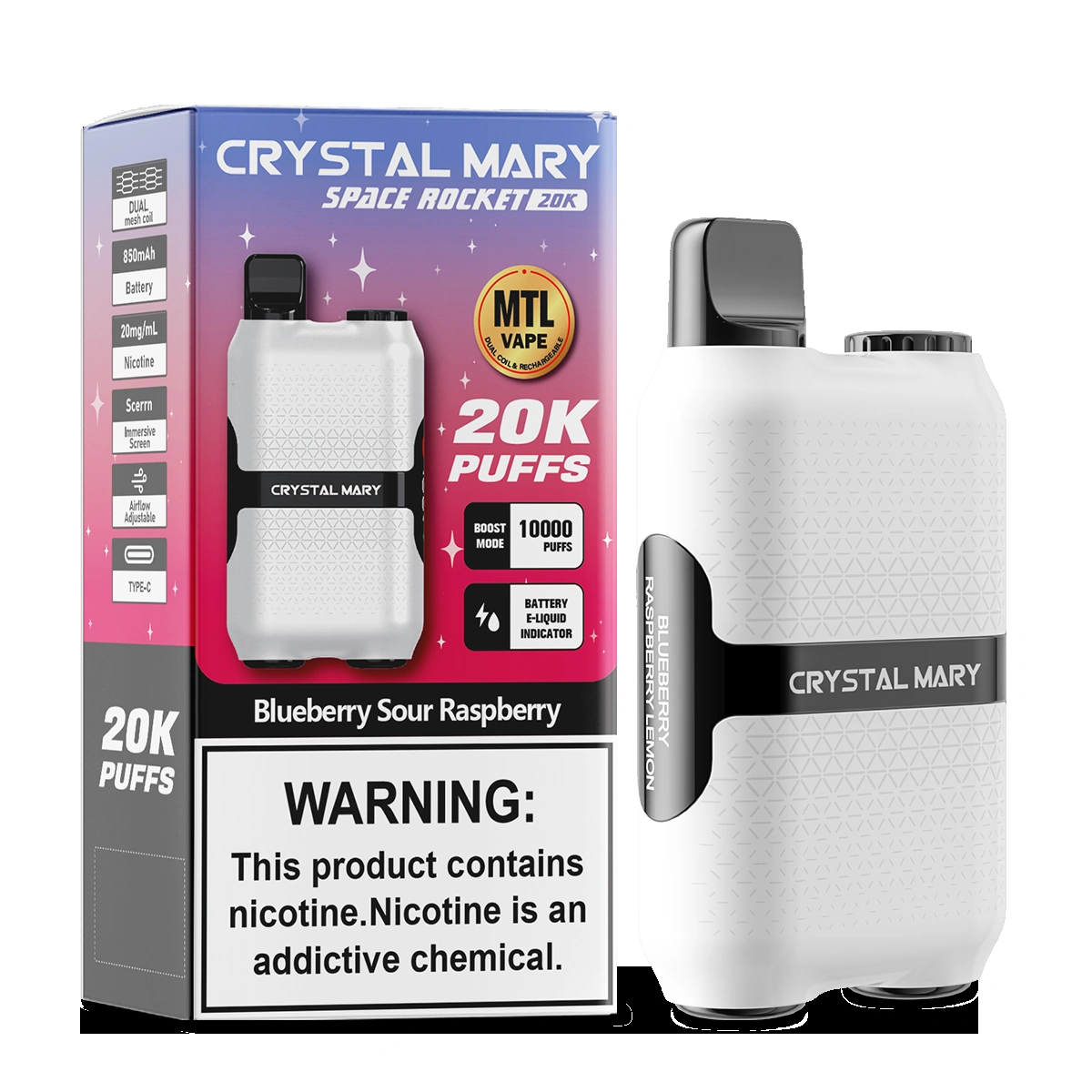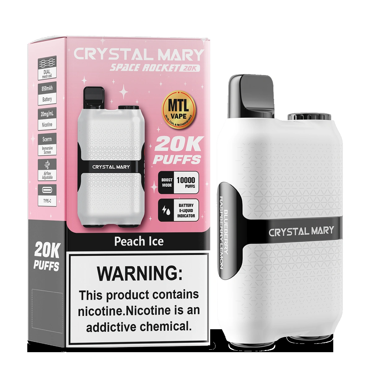 Se está cansado de mudar de vape de poucos em poucos dias, este produto vai facilitar-lhe a vida. O vape Crystal Mary space rocket tem uma duração ultra longa e pode alternar livremente entre o modo normal e o modo melhorado. O modo normal foi ajustado para aumentar a duração da bateria. O modo melhorado tem um maior impacto, mas consome mais fumo.